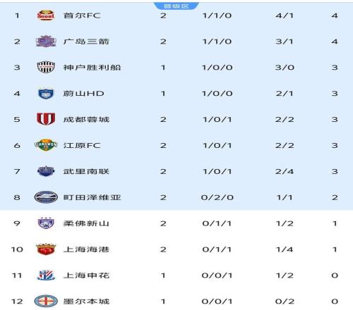 最新積分榜方面,均取得1勝1平的首爾FC和廣島三箭同積4分,首爾FC憑借凈勝球優(yōu)勢暫時排在第1,廣島三箭暫居第2。